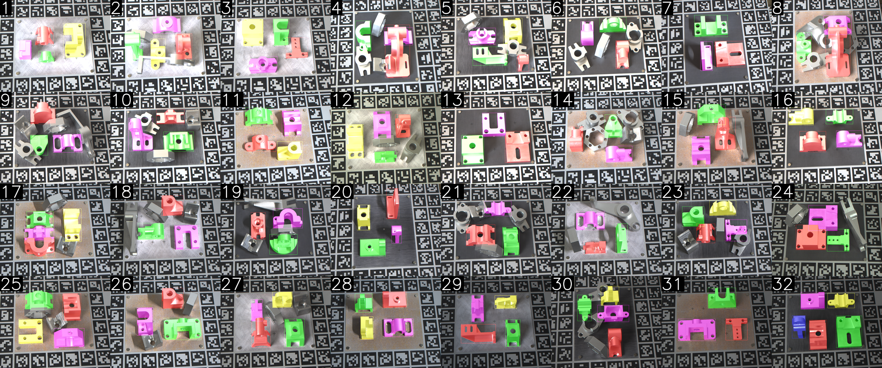 32 scenes simulate real scenes in terms of parts placement, parts types and shape, lighting, background, etc.